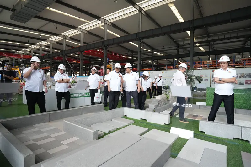 ในพื้นที่จัดแสดงตัวอย่างอิฐ อิฐซึมเข้าไปได้ต่างๆ อิฐหินเลียนแบบ และวัสดุก่อสร้างรีไซเคิลขยะมูลฝอยดึงดูดความสนใจของกลุ่มผู้เยี่ยมชม Fu Binghuang ประธานบริษัท Quangong Machinery Co.,Ltd อธิบายว่าผ่านการวิจัยและพัฒนาทางเทคโนโลยี Quangong Machinery Co.,Ltd. เปลี่ยนขยะเช่นขยะจากการก่อสร้างและกากแร่ให้เป็นวัสดุก่อสร้างที่มีมูลค่าเพิ่มสูงและเป็นมิตรกับสิ่งแวดล้อม โดยกำจัดขยะมูลฝอยมากกว่า 10 ล้านตันต่อปี ประธานหลิว กั๋วเฉวียน ตรวจสอบความแข็งแรงและการซึมผ่านของตัวอย่างอิฐ โดยยกย่องแนวทางปฏิบัติของ QGM ในการ "เปลี่ยนขยะให้เป็นสมบัติ" ในฐานะ "แบบจำลองของเศรษฐกิจหมุนเวียน"