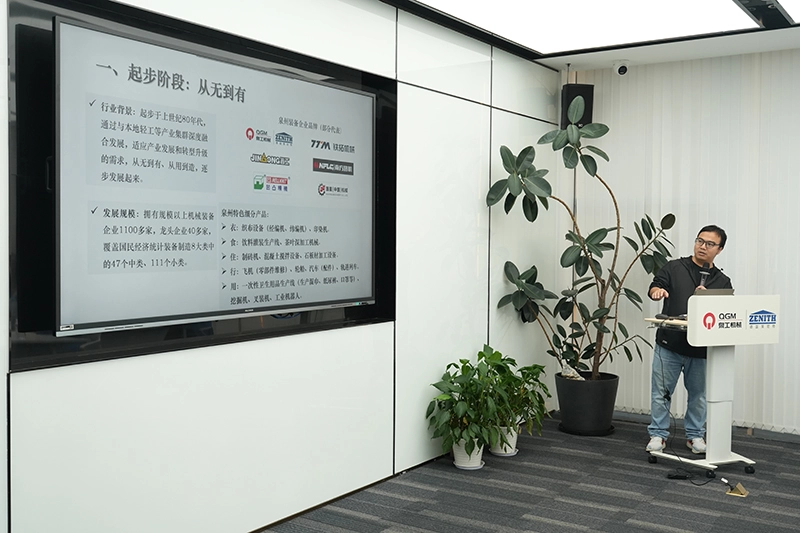 ในห้องประชุม เจ้าหน้าที่จากแผนกอุปกรณ์ของสำนักงานอุตสาหกรรมและเทคโนโลยีสารสนเทศเทศบาลเมืองฉวนโจว อธิบายสถานการณ์พื้นฐาน ประวัติการพัฒนา และแนวโน้มในอนาคตของอุตสาหกรรมการผลิตอุปกรณ์ของเฉวียนโจว นอกจากนี้ยังมีการแสดงวิดีโอโปรโมตของบริษัท Quanzhou Machinery Industry Co., Ltd.